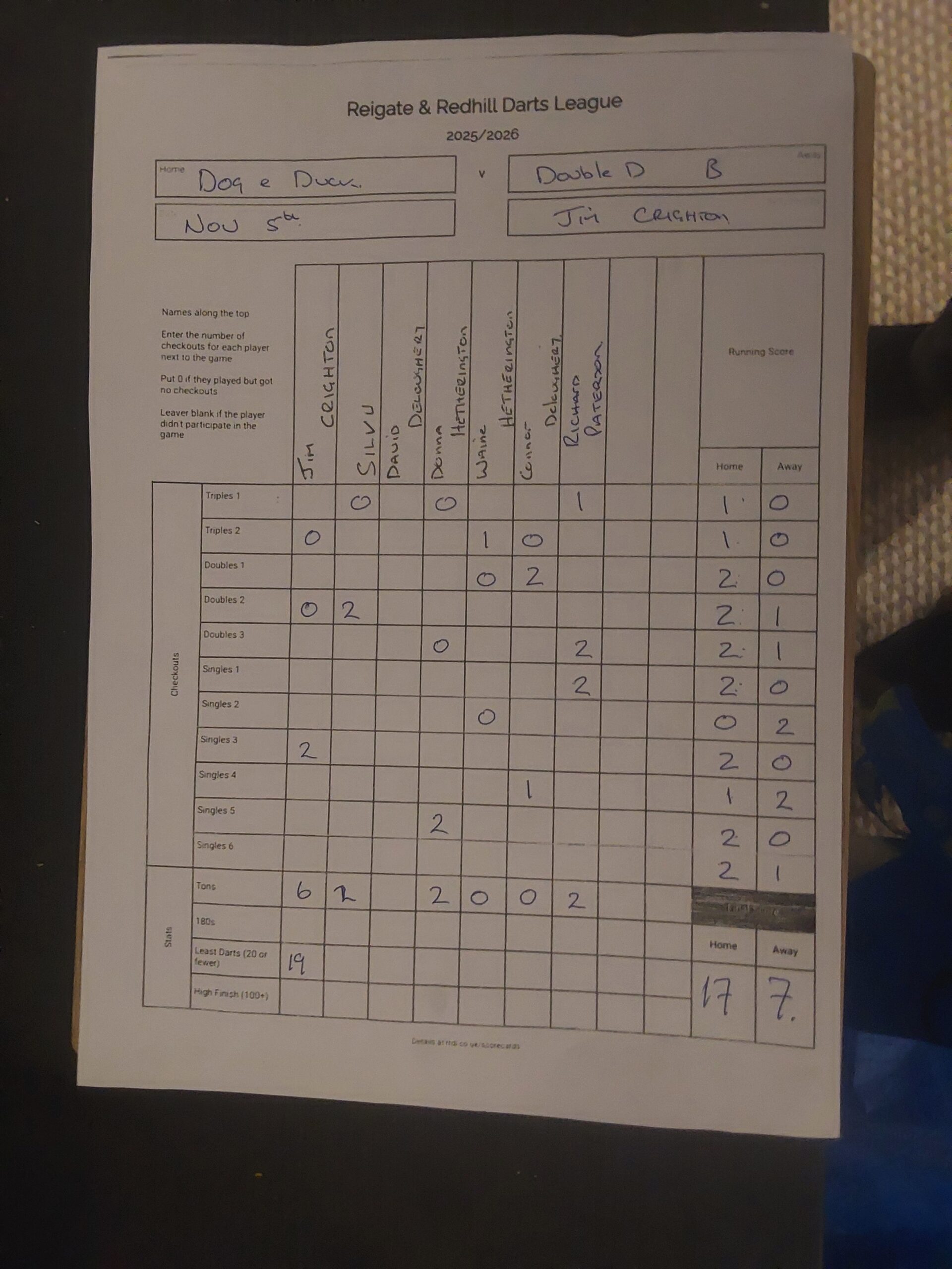 | Dog & Duck | First warning | 3 Nov – missing player (sixth singles) |